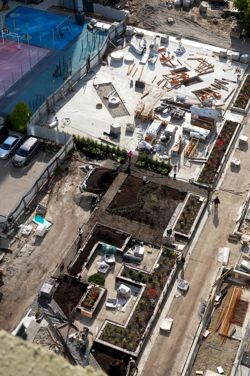 На первый взгляд — хаос: тротуарная плитка, инструменты, строительные каски в кучках, следы бетона. Но если присмотреться — все это не беспорядок, а творческий процесс.